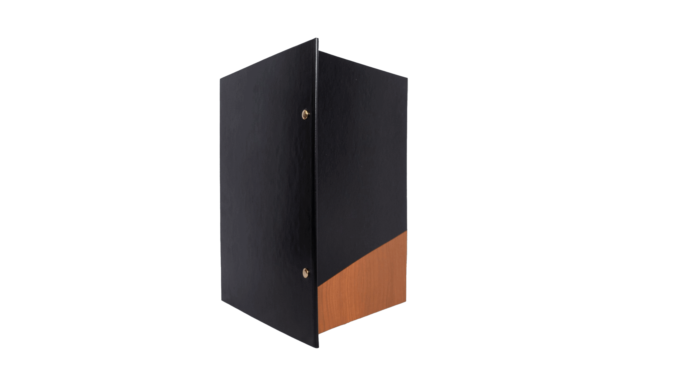 Parte inferior recortada: uma barra inclinada subtilmente para cima, revestida em tecido com efeito madeira, que adiciona textura e sofisticação à capa.