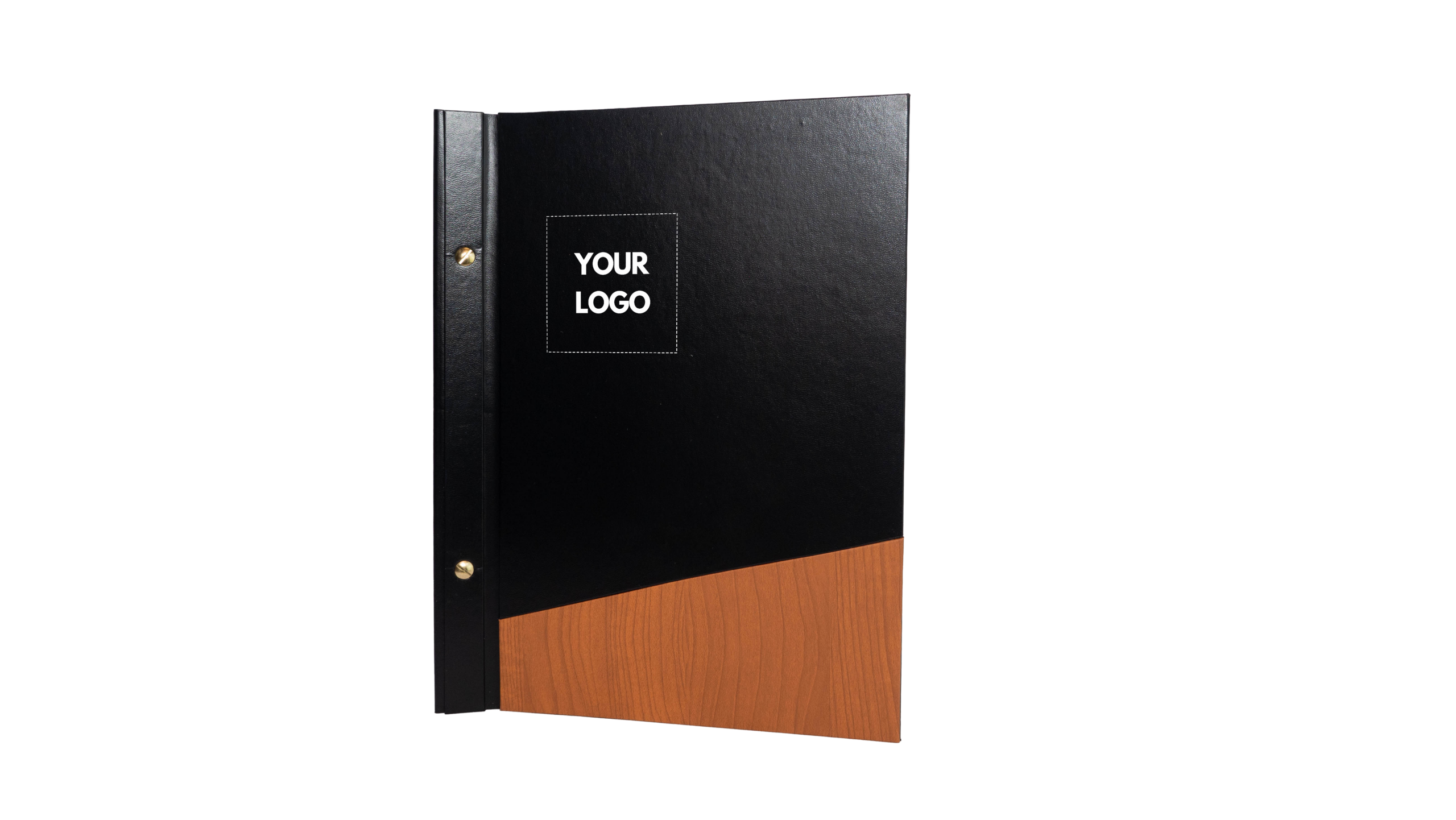 A personalização é efetuada nesta área preta, com gravação a quente ou impressão, permitindo aplicar o logotipo ou nome do restaurante. As opções de cor incluem: ouro, prata, preto, azul metálico claro, azul metálico escuro ou branco.